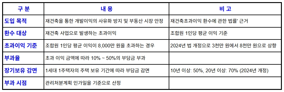 즉, 재건축 사업이 완료된 후, 조합원 1인당 평균 이익이 3천만 원을 초과하면, 그 초과분에 대해 일정 비율의 부담금을 부과한다.