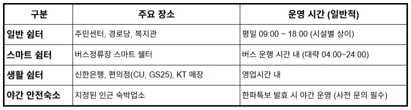 - 폭설이나 극심한 한파가 지속될 때는 운영 시간이 연장되거나 임시 쉼터가 추가될 수 있습니다.