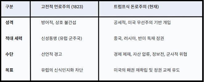 전통적인 먼로주의가 유럽의 간섭을 막는 '방어적' 성격이 강했다면, 돈로주의는 미국에 위협이 되는 요소를 사전에 제거하려는 '공세적' 성격이 짙다. 트럼프 행정부는 중남미를 미국의 절대적인 영향력 아래 두어야 할 구역으로 간주하며, 이곳에서 벌어지는 반미 활동을 미국의 국가 안보에 대한 직접적인 도발로 규정한다.