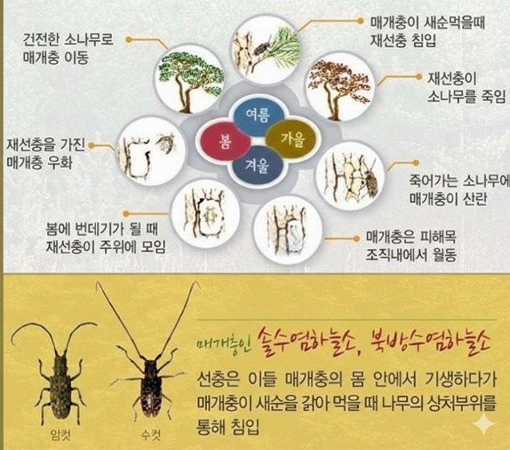 - 증식: 침입한 재선충은 나무 속의 곰팡이나 세포를 먹으며 급격히 증식합니다. (1쌍의 재선충이 20일 만에 약 20만 마리로 불어납니다.)