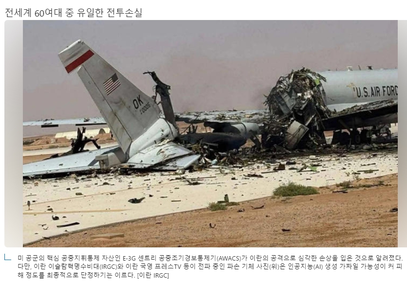 E-3는 전 세계에서 약 60여 대(미국 약 30대 포함)밖에 운용되지 않는 귀한 자산입니다. 보잉 707 기체를 기반으로 하기에 기령이 오래되어 신규 생산이 어렵고, 현재는 차세대 기종인 E-7 웨지테일(Wedgetail)로의 교체가 진행 중인 과도기적 시점입니다. 이런 상황에서 실전 파괴는 미 공군의 작전 능력에 공백을 초래할 수 있습니다.