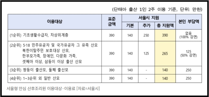 - 일반 산모: 전체 요금 390만 원 중 140만 원을 서울시가 지원하여, 실제 산모는 250만 원만 부담하면 됩니다.