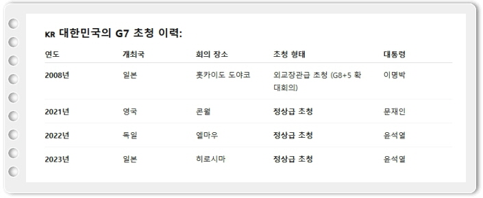 G7 정식 회원국은 아니지만, 초청을 통해 글로벌 아젠다 논의에 참여하고 외교적 영향력 확대에 활용하고 있다.