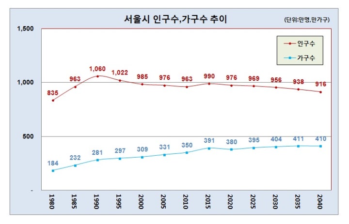 참고로, 서울시의 인구와 가구수 추이를 보자.