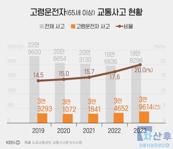 한국도로교통공단 교통사고분석시스템에 따르면 지난해 65세 이상 고령 운전자 교통사고는 4만2369건으로 전체 사고의 21.6%를 차지했다. 2005년 통계 작성 이후 최고치로, 2020년(14.8%) 대비 6.8%포인트 증가했다. 사고 건수도 2021년 3만1841건, 2022년 3만4652건, 2023년 3만9614건으로 매년 꾸준히 늘고 있다.