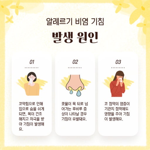 - 이 외에도 눈 충혈, 목 이물감, 두통, 피로감 등이 동반될 수 있다.