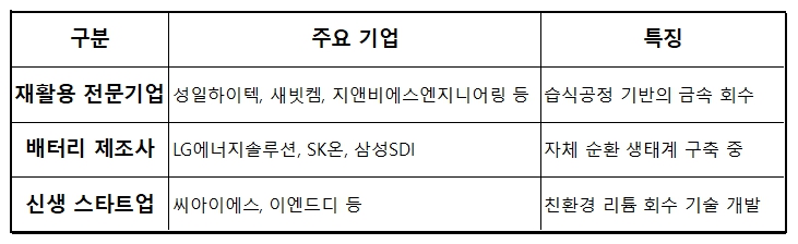 - 전기차 배터리 중심 확대: 2020년대 들어 전기차 폐배터리가 주요 재활용 대상이 되고 있다.